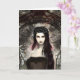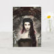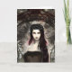 Art d'IA représentant un Ange déchu. Belle femme avec des ailes métalliques steampunk donnant une impression sombre et inquiétante sur une carte blanche.