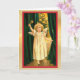 La façade de cette carte de voeux de Fêtes est ornée d'une image d'époque d'une petite fille d'ange vêtue de blanc avec une tête étoile. Elle sonne une cloche dorée avec des rideaux de velours vert qui s'ouvrent partiellement pour montrer un férié brillant dans le arrière - plan. L'image est placée sur un arrière - plan de dégradé d'or léger et est bordée de rouge avec une fine ligne d'or. L'intérieur de la carte est en vert uni correspondant sur la gauche et l'autre côté est blanc, et partiellement vide pour votre propre message, avec des champs de texte personnalisés pour votre signature en bas. Célébrez Noël de la manière désuète avec cette belle carte qui présente une image d'autrefois.
