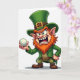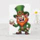 This greeting card features a leprechaun centered on a bright white background, drawn with strong outlines and deep shading that makes him stand out. His fiery orange beard and thick brows frame wide blue eyes and a tight, toothy grin that feels like a teasing dare shared between close friends. He wears an emerald green top hat and matching jacket, with a gold buckle on the hat and a gold belt detail catching the light in warm contrast. In his left hand, he holds a carefully detailed golf ball, its tiny dimples clear as if he’s offering it like a cheeky little trophy ☘️. The pose leans forward slightly, as though he’s mid-challenge, but the sparkle in his stare keeps it more friendly than fierce 💚. There’s no scenery beyond the white field, so the greens, oranges, and golds become the whole setting. A small line of St. Patrick’s Day text sits near the top in green lettering, leaving plenty of open space around the character. The golf ball rests just below chest level, bright against the darker sleeve, with the gold accents gleaming beside it.