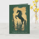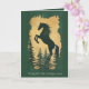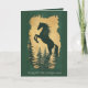 Silhouette de forêt majestueuse d'un cheval se cabrant avec des tons dorés chauds, stylisée pour l'Année du Cheval 2026. Une élégante carte de vœux pour la nouvelle année pour les amoureux de la nature et les cadeaux équestres. Mise en page vierge avec des champs modifiables à l'intérieur pour votre message, nom, ville et année. Carte