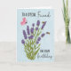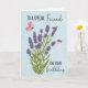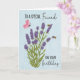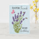 C'est une carte d'anniversaire avec un plante lavande qui a deux abeilles et un papillon volant autour. L'arrière - plan est d'un bleu clair avec une texture nuageuse et le texte, "À un ami spécial pour votre anniversaire."