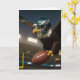 Un aigle chauve portant un casque de football survole un stade, tenant un football dans ses talons, sur un fond lumineux avec des lumières sombres du stade. Le texte est modifiable.