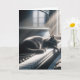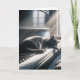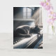 Un chat gris foncé dort tranquillement sur les touches d'un piano à queue, baigné de lumière douce qui traverse une fenêtre voisine pour avoir un humour d'anniversaire plus vieux. Tout le texte peut être modifié.