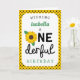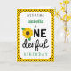 Souhaitez à votre enfant en bas âge préféré par joyeux premier anniversaire avec cette carte ensoleillée comportant le pois jaune et noir, et à un tournesol remplaçant l'o dans "l'anniversaire onederful." Personnalisez la carte d'anniversaire avec le nom de la fille d'anniversaire en vert, assortissant la couleur du feuille du tournesol.