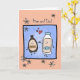 Cette carte mignonne d'anniversaire pour votre mère et père comporte une illustration lunatique de bande dessinée d'une bouteille de sirop de chocolat et d'une cruche de lait tenant des mains sur un arrière - plan bleu de point de polka avec les coeurs rouges et les marguerites blanches encadrés à l'intérieur d'un arrière - plan de pêche.