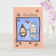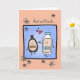Cette carte d'anniversaire mignonne pour votre tante et votre oncle présente un dessin humoristique fantaisiste d'une bouteille de sirop de chocolat et d'une cruche de lait tenant la main sur un arrière - plan à pois bleu avec des coeurs rouges et des marguerites blanches encadrées à l'intérieur d'un arrière - plan pêche.