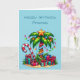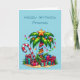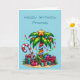Carte d'anniversaire avec une image de vacances saisonnière. Un palmier tropical orné de lumières festives surmonté d'une étoile. Un sucre de canne géant rouge et blanc qui sort du sable. Dons sous l'arbre. Whimsical et amusant.