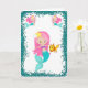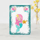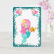 Une carte d'anniversaire très douce aux sirènes avec une mignonne sirène aux cheveux roses qui caresse son poisson rouge, entouré d'un cadre de parties scintillant turquoise (pour imiter le sable). L'intérieur contient une autre image de sirène, et le salut traditionnel d'anniversaire (Joyeux anniversaire) qui peut être customisé à convenir.