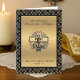 Célébrez l'anniversaire / ordination à la prêtrise avec cette belle image religieuse catholique traditionnelle d'un agneau sur l'autel sur fond doré brillant bordé d'un motif noir et or. Le texte et les polices peuvent être modifiés.