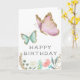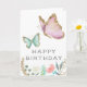 Carte d'anniversaire fantaisie avec papillons rose et menthe aux imprimés faux or parties scintillant. Ils volent au-dessus d'un jardin fleuri coloré. Le texte dit "JOYEUX ANNIVERSAIRE."