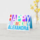 Cette carte d'anniversaire présente un arrière - plan blanc avec un texte géométrique coloré "Joyeux Anniversaire" dans plusieurs couleurs vives et audacieuses. Le nom personnalisé de votre choix est présenté en bleu sous "Joyeux anniversaire". À l'intérieur, vous trouverez un joli texte bleu arrière - plan et blanc qui dit : "Envoi de voeux pour une journée lumineuse et heureuse." Cliquez sur "Personnaliser ce Modèle" pour modifier facilement le nom de l'exemple et le texte intérieur.