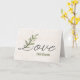 LOVE texte dans une police de script élégante avec des feuilles verts et des noms de couple sur la texture neutre douce arrière - plan anniversaire.