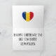 Un beau design comprenant des ballons joyeux et des banderoles avec les mots "Joyeux Anniversaire", recouverts des couleurs du drapeau de la Roumanie. Le design est complété par un cœur dans les couleurs du drapeau de la Roumanie et le message d'anniversaire. Les éléments sont entièrement personnalisables à l'aide de la fonctionnalité "Personnalisez-le !". Cette carte d'anniversaire colorée est le cadeau idéal pour votre ami de Roumanie. © PaysDuMonde