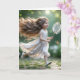 Une jeune fille aux cheveux flottants court joyeusement à travers un jardin éclairé par le soleil, tenant un filet de papillon alors qu'elle chasse les papillons. Le texte intérieur peut être modifié.