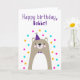 Carte d'anniversaire pour Bubbe. Si vous appelez votre grand-mère Bubbe au lieu de grand-mère, cette carte d'anniversaire est parfaite pour elle. (Bubbe signifie grand-mère en yiddish.) Votre bubbe va adorer le design mignon, moderne, coloré, de style scandinave de cette carte d'anniversaire qui comprend un ourson en peluche marron et gris avec un casquette de fête violet et cravate et rose, jaune et bleu confetti avec le texte "Joyeux anniversaire, Bubbe !" Rendre cette carte personnalisable ! Cliquez sur "Edit Design", "Inside Bottom/Right : Text & Images", "Text" et "Add text" pour écrire votre propre message personnalisé à Bubbe à l'intérieur!