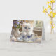 Un chaton blanc et moelleux aux yeux bleus saisissants est niché à l'intérieur d'une tasse fleurie bleue et blanche sur une nappe en dentelle avec des fleurs oubliées, pas de fleurs comme la lumière du soleil filtre à travers une fenêtre. Le texte intérieur peut être modifié.