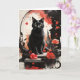 Portrait aquarelle de chat noir avec éclaboussures d'art et fleurs rouges sur fond rouge et noir. Carte de vœux vierge pour anniversaire, anniversaire de mariage, nouveau bébé, merci, condoléances, etc.