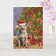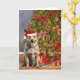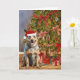 Cette carte de Noël présente un portrait aquarelle d'un chien de bétail australien portant un chapeau de Père Noël assis sous un arbre de Noël.