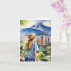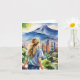 Cette carte de voeux présente un portrait aquarelle d'une femme blonde surplombant Medellin, en Colombie.