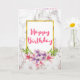 Une joyeuse carte de voeux d'anniversaire avec un design moderne - une texture imitation marbre en blanc compose l'arrière - plan. La couche supérieure est un cadre avec une fausse bordure en feuille d'or. De grandes fleurs de magnolia couleur rose et violet aux accents de feuilles vertes ornent le décor. Message à l'intérieur duquel peut être personnalisé si vous le souhaitez.