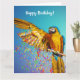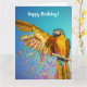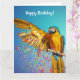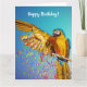 Un ara bleu et jaune lance des confettis colorés pour l'anniversaire de votre proche.
