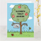 Une carte de voeux pour célébrer une naissance, qui peut être personnalisée avec le nom, la date de naissance et le poids de naissance. La carte présente une scène de jardin colorée avec un pommier, un bourdonnement de bourdons et un loup qui scuttait au sol.