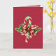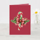 Un sucre de canne vert, rouge et blanc est organisé avec des sprigs à feuillage persistant et un arc rouge et blanc sur un arrière - plan rouge, créant une belle et festive carte de Noël. L'intérieur de la carte est également rouge, avec l'accueil en blanc.
