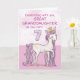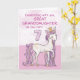 Une jolie petite licorne rose tout comme votre arrière-petite-fille qui gambade avec le numéro sept ! Des détails de couleur dorée sont tissés dans sa crinière et sa queue. Carte parfaite pour souhaiter un bon anniversaire à votre arrière-petite-fille pour ses 7 ans !
