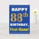Ce design de carte anniversaire-orienté simple de salutation comporte un souhait chaud d'anniversaire comme le "JOYEUX quatre-vingt-dix-huitième ANNIVERSAIRE, prénom !" sur l'avant, en caractères gras sur un bleu a coloré l'arrière - plan. Le nombre d'anniversaire a un faux/imitation or-comme le regard de coloration. Le nom sur l'avant peut être customisé. Les caractéristiques intérieures un message personnalisable d'anniversaire. Une carte de voeux comme ceci pourrait être une manière d'amusement de fournir des souhaits d'anniversaire à quelqu'un qui célèbre leur huitième anniversaire quatre-vingts. [~Z0000278]