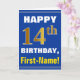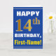 Ce design de carte anniversaire-orienté simple de salutation comporte un souhait chaud d'anniversaire comme le "JOYEUX 14ème ANNIVERSAIRE, prénom !" sur l'avant, en caractères gras sur un bleu a coloré l'arrière - plan. Le nombre d'anniversaire a un faux/imitation or-comme l'aspect de coloration. Le nom sur l'avant peut être personnalisé. Les caractéristiques intérieures un message personnalisable d'anniversaire. Une carte de voeux comme ceci pourrait être une manière d'amusement de fournir des souhaits d'anniversaire à quelqu'un qui célèbre leur quatorzième anniversaire. [~Z0000278]