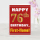 Ce design de carte anniversaire-orienté simple de salutation comporte un souhait chaud d'anniversaire comme le "JOYEUX soixante-seizième ANNIVERSAIRE, prénom !" sur l'avant, en caractères gras sur un rouge a coloré l'arrière - plan. Le nombre d'anniversaire a un faux/imitation or-comme l'aspect de coloration. Le nom sur l'avant peut être customisé. Les caractéristiques intérieures un message d'anniversaire qui peut être personnalisé. Une carte de voeux comme ceci pourrait être une manière d'amusement de fournir des souhaits d'anniversaire à quelqu'un qui célèbre leur sixième anniversaire soixante-dix. [~Z0000276]
