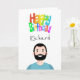 Image mignonne d'un personnage masculin avec du texte personnalisable à l'intérieur et à l'extérieur et coloré Joyeux texte d'anniversaire sur le devant. Les cheveux, les sourcils et les couleurs des vêtements peuvent facilement être changés.