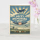 This Memorial Day design is inspired by classic 1930s–1940s aviation posters, honoring service in the skies with bold optimism and reverence. A vintage propeller aircraft climbs upward through radiant sunburst rays, symbolizing courage, ascent, and sacrifice. Below, a winged star emblem anchors the message “Happy Memorial Day,” echoing military insignia and air service iconography. In the distance, an airfield with control tower and hangars grounds the scene in duty and readiness, while additional aircraft streak across the sky in formation. Rendered in heritage blues, creams, and muted reds, the design balances heroic motion with solemn remembrance.
