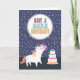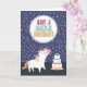 Une adorable licorne blanche, avec crinière arc-en-ciel et queue, et un gâteau arc-en-ciel sur un arrière - plan violet avec confettis d'or. La carte parfaite pour l'anniversaire de chaque amant de licorne. Texte personnalisable à l'intérieur : "Soyez une licorne dans un champ de chevaux"