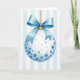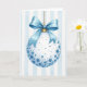 This festive digital drawing shows a fancy round Christmas ornament on a striped background. The ornament is all white with a soft blue bow on top and golden details. It has pretty blue flowers and dots on it. The background has big blue and white stripes. The design looks elegant and soothing, perfect for the holiday season. On the ornament, you can see tiny details like flowers and dots. This card is great for spreading some holiday cheer! 🎅🏼🎄🎁