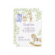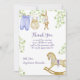 La carte de Baby shower en Merci plat présente de belles illustrations aquarelle de vêtements de bébé mignons accrochés sur une ligne à sécher, un mignon lapin farci, un adorable cheval à bascule au bas de la carte, et tous ces articles sont entourés de branches délicates avec des feuilles vert clair.