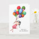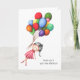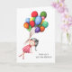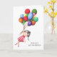 Carte d'adieu simple pour fille avec l'illustration d'une jeune brune qui s'en va avec des ballons colorés. Illustré et dessiné par Patricia Alvarez.