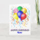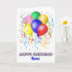 Un bouquet de ballons et de serpentins avec les mots Joyeux Anniversaire en dessous d'eux. Il y a un endroit pour ajouter le nom du destinataire. Timbre-poste correspondant disponible.