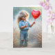 Une petite fille pieds nus portant un jean denim déchiré et tenant un ballon rouge dans un champ de campagne pour l'anniversaire d'une fille. Tout le texte peut être modifié.