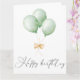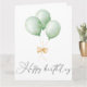 Pretty mint green balloons tied with a golden bow float above an elegant calligraphy 'Happy birthday' script. Embellished with a decorative heart flourish on the letter h and letter p.