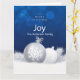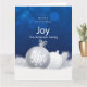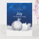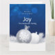Célébrez votre Noël d'hiver avec style grâce à ce design bleu et blanc festif avec des baubles d'arbre argent et blanc avec un motif de flocon de neige reposant dans la neige fraîche. Les mots "Joyeux Noël" et "Joie" apparaissent au-dessus des décorations et un livre bleu est vu dans l'arrière - plan. Personnalisez l'accueil intérieur pour rencontrer votre salutation de vacances ou message à vos amis et votre famille.