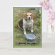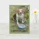 Carte Beagle levant la tête de son bol de nourriture.