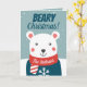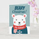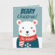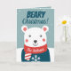 Un ornement de Noël à la barbe personnalisable avec un amusant ours en caricature blanc sur un arrière - plan enneigé, avec un pull bleu et un foulard rouge. Le foulard rouge affiche le nom de famille personnalisable sur une police blanche et élégante.