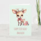 Carte d'anniversaire avec l'illustration d'un adorable cerf de bébé. Grands yeux grands oreilles avec une grande tête et des petits bois bruns. Portant un gros arc rouge. À côté d'une pile de cadeaux.