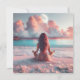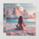 Belle femme méditant sur une plage de sable blanc et de verre de mer brillant. Nuages roses et bleus fluffy et eau bleu pâle.