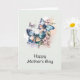 Carte de la fête des mères avec un trio de papillons flottant parmi de jolies fleurs. Couleurs bleu rose et vert.