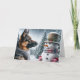 Un berger allemand portant un foulard fait face à un bonhomme de neige gai orné d'un casquette et d'un foulard rayé dans un arrière - plan paysager enneigé. Le texte peut être modifié.