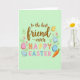 This greeting card features a soft mint green background with a friendly two-part message centered on the front. Near the top center, “to the best friend ever” appears in smooth brown cursive lettering, giving the words a gentle, affectionate tone. Just below it, “HAPPY EASTER” is set in rounded, multicolored letters—pinks, oranges, yellows, and blues—with a thin outline that helps each letter stand out. Around the text, four decorated eggs in speckled pink, sunny yellow, and light blue sit like little gifts, each dotted with small white spots for added texture 🐰. Tender green leafy sprigs and small, simple flowers curl around the message, creating a loose wreath shape that feels like a friendly hug between close companions 🌷. In the lower right corner, an orange carrot with leafy green tops adds a bright accent and balances the layout. The flowers are scattered in soft tones near the edges, with the eggs spaced evenly around the center to frame the words.