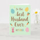 This card features a soft pastel green background that feels like an early spring morning 🌷. Centered down the page, the main message reads “to the best Husband Ever” in warm brown lettering, arranged tall so it becomes the focal point. Around it float four decorated egg shapes in gentle blue, yellow, and pink, detailed with white dots, small curving accents, and tiny white flower clusters that add a sweet, affectionate tone. Four orange carrots with leafy green tops are scattered nearby, giving the scene a fresh-from-the-garden look that pairs nicely with the loving message. In the lower left, a simple pink bunny with long ears looks upward with a tender, admiring gaze 🐰. Two small yellow starburst-like flowers sit in open spaces like little glints of light. Beneath the main wording, “HAPPY EASTER” appears in mixed bright colors, each letter spaced out in a tidy line near the bottom. The eggs show white polka dots, curled pink lines, and small white blossoms against their pastel shells.
