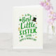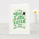 Perfect for sharing this St. Patrick’s Day card features a sweet sister-to-sister message set on a soft off-white background with layered green lettering and lucky accents 💚. In the center, the text reads “to the Best Little Sister EVER,” with “to the” in small green type above, “Best” large and flowing in a deeper green, and “Little Sister” tucked beneath in a simpler green style that feels steady and close. “EVER” sits at the end in matching green, finishing the line with extra emphasis. Small green shamrocks are sprinkled around the words like confetti, adding a gentle, friendly energy ☘️. Tiny gold asterisks sparkle between the letters, and a black leprechaun hat with a gold buckle rests above “Best” like a cheeky little crown. A gold horseshoe curves near the word “Little,” echoing the lucky theme while keeping the focus on the sisterly bond. Along the bottom, “HAPPY ST. PATRICK’S DAY” arcs in deep emerald green, framed by scattered shamrocks and gold accents on the cream backdrop for sharing St. Patrick’s Day sentiments.